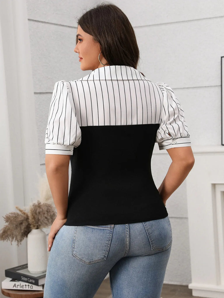 Plus Size Striped Johnny Collar Short Sleeve Blouse