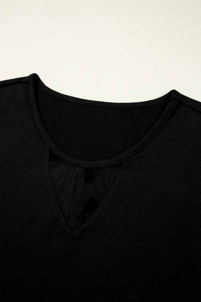 Black Floral Mesh Patchwork Loose V Neck Plus Size T Shirt